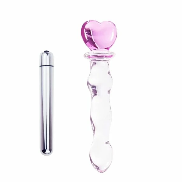 Fall head over heels for the PleasureStore Pink Glass Heart Dildo & Bullet Vibe Set. So pretty, youβll be reluctant to hide it away, its heart-shaped handle that leads to a stunning gentle flared head.