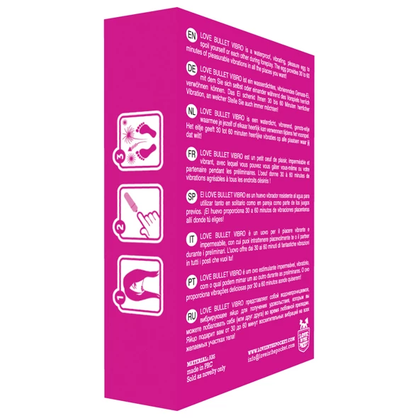 LOVE BULLET VIBRO is a waterproof, vibrating, pleasure egg to spoil yourself or each other during foreplay. The egg provides 30 to 60 minutes of pleasurable vibrations in all the places you want! Made from safe materials.