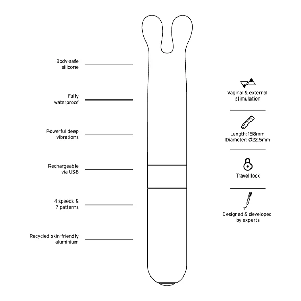 Are you the type of person who canβt make up their mind? Then this twist on the infamous rabbit and classic bullet is for you. It packs all the punch of a larger toy and is perfectly shaped to massage your clit, or hit your g-spot and its smooth silky silicone feels great against nipples. This blended toy with its sculpted ears will bring pleasure to spots you didnβt know needed it.
